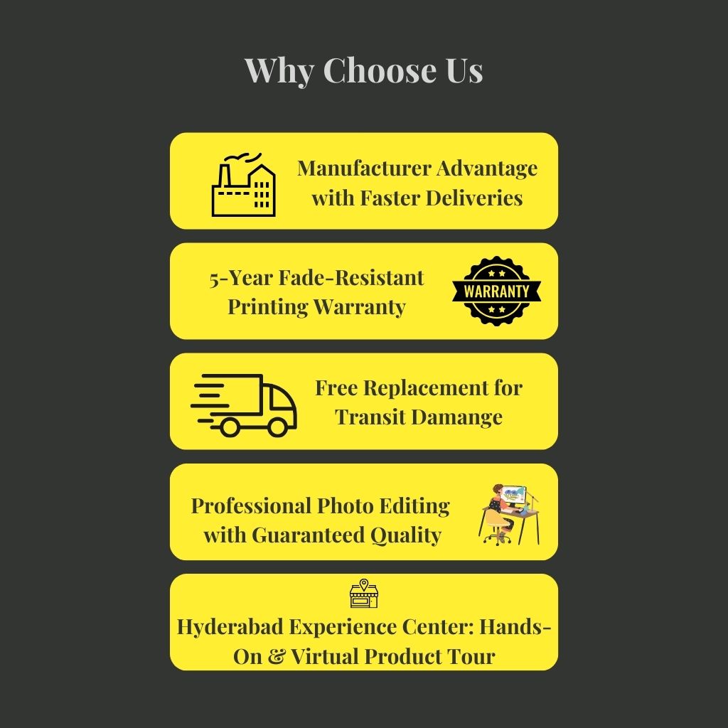 Select a product, upload photos, and place your order. You'll receive confirmation. Our team will prepare a proof for your approval, allowing revisions. Once approved, your order goes in production & gets shiped. For support, contact +91-7675042060 (phone) or +91-9392858880 (WhatsApp).