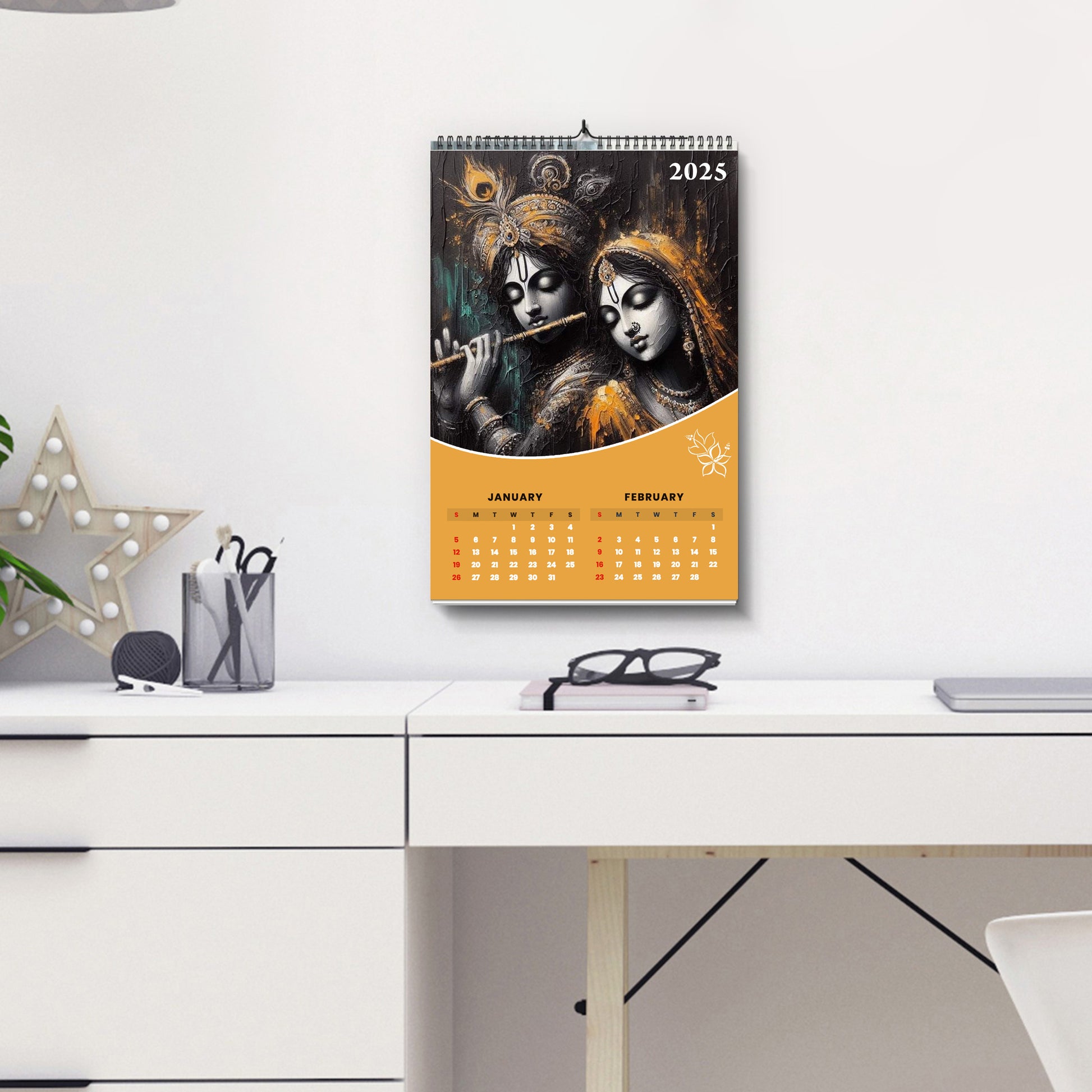 Beautifully designed Lord Krishna calendar for desk and wall, featuring vibrant images of Krishna. Perfect for adding a spiritual touch to your home or office.