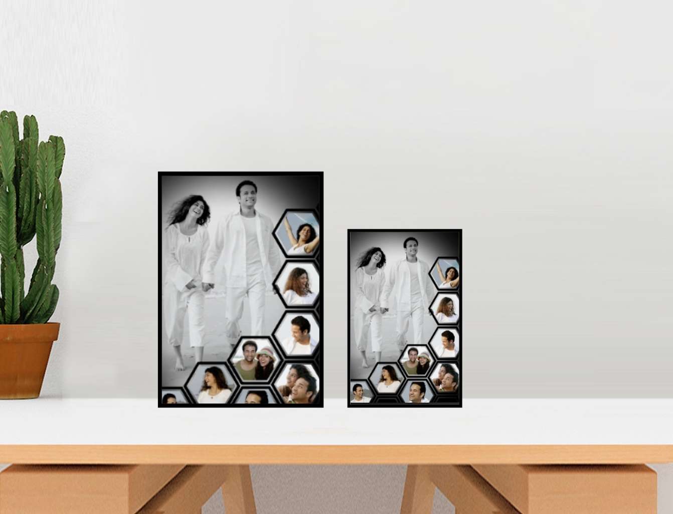 Showcase your cherished memories with our Photo Frame Collage - Desk Photo Lamination. Designed to hold multiple images in a beautifully arranged layout, this matte-finish, sleek 8mm profile frame offers a stylish and clutter-free look. The sturdy SS metal rod stand allows for easy placement in both portrait and landscape orientations.